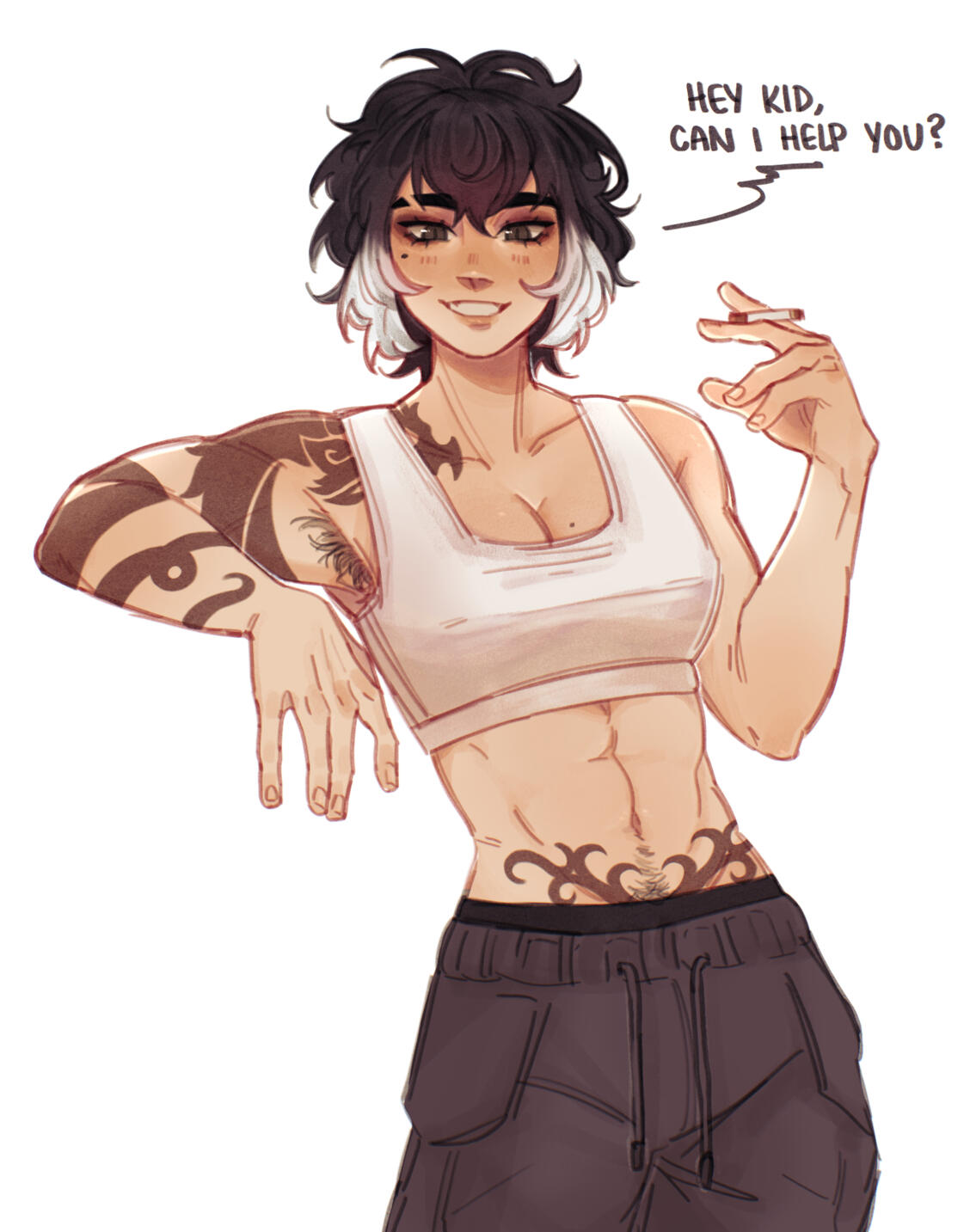first impression. aiko is rough around the edges. she is almost always holding a cigarette. she wears plain clothes, often a dirtied tank top and sweatpants. she smells like sweat, motor oil, and cigarette smoke. if she is working, there is likely motor oil, grease, or dirt on her clothing and skin. she is loud when she talks and louder when she laughs. her voice is slightly raspy from smoking, and slightly deeper than expected of a woman. she gets straight to the point when she speaks, and she curses loudly, unapologetically, and incredibly often.