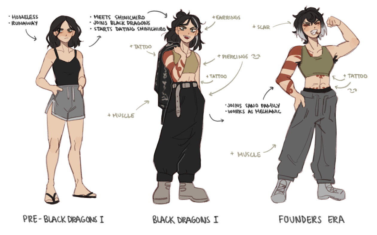 black dragons era. her reputation as a thief caught up to her as she stole quite a bit of cash and property from multiple black dragons gang members. when she gets caught by wakasa and takeomi, she is brought before shinichiro and agrees to join black dragons to pay back her accumulated debt. shinichiro takes a liking to her and for once, the feeling is mutual. the two begin dating and he lets her move in with him so she isn't homeless. she runs the reconnaissance unit of the black dragons under shinichiro's command. he teaches her what he knows about motorcycles and employs her as a mechanic assistant at his bike shop so she isn't unemployed.