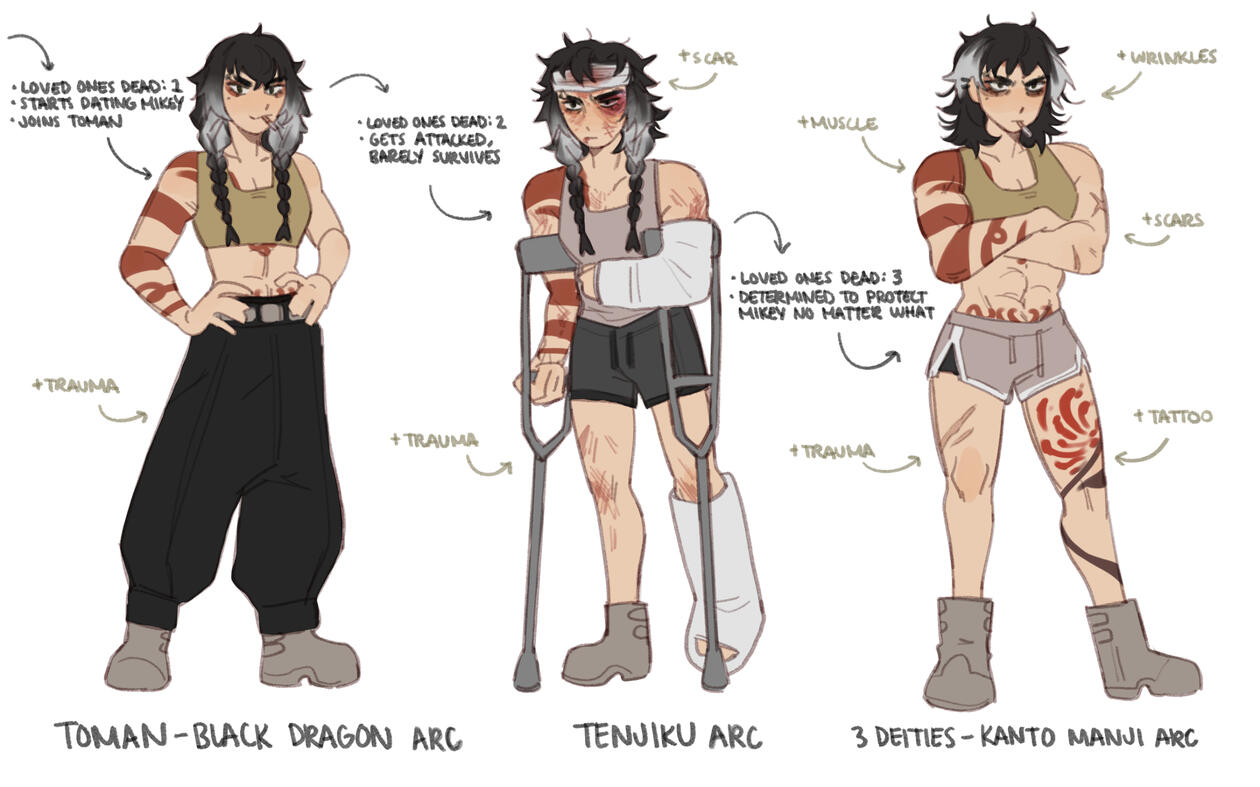 tenjiku. aiko is severely, brutally attacked by multiple members of the gang tenjiku and is left for dead. she barely survives and is in a coma for over a week, missing the events of the kanto incident. she leaves the hospital with a broken arm, a broken leg, a massive forehead scar, and a lifetime of chronic headaches. the event severely traumatizes her, although she never speaks of it to anyone. as soon as she's healed, she chops her hair off, gets a full leg tattoo, and starts to excessively exercise to bulk up as much as possible in hopes of protecting mikey and preventing something like the tenjiku attack from ever happening again.